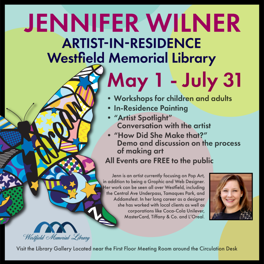 Jennifer Wilner was the artist in residence at the Westfield Memorial Library from May 1, 2024 to July 31, 2024. Her residency was a great success. Please see details about Jennifer below and visit her website and follow her at @jenniferwilnerart.