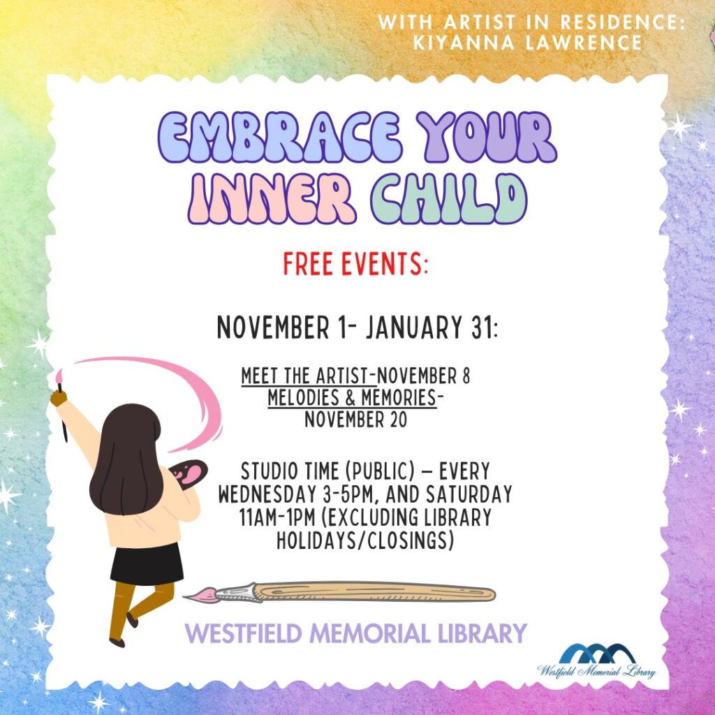 Kiyanna Lawrence was the Artist Residence at the Westfield Memorial Library from November 1, 2024 to January 31, 2025; her residency had a theme of “Embrace Your Inner Child.” Kiyanna was at the library working on her beautiful artwork every Wednesday and Saturday.