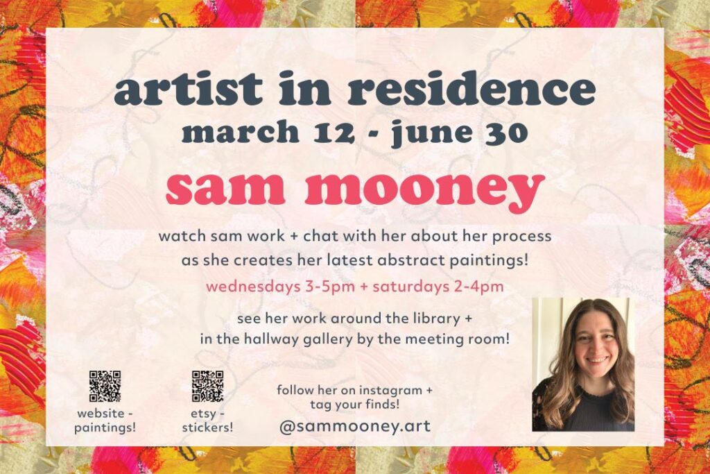 Samantha Mooney was the Artist in Residence at the Westfield Memorial Library from March 12, 2025 to June 30, 2025. Sam created her artwork at a table right in front of the main entrance to the library and interacted with many library patrons during her residency. Sam shared her colorful, abstract artwork throughout her residency.